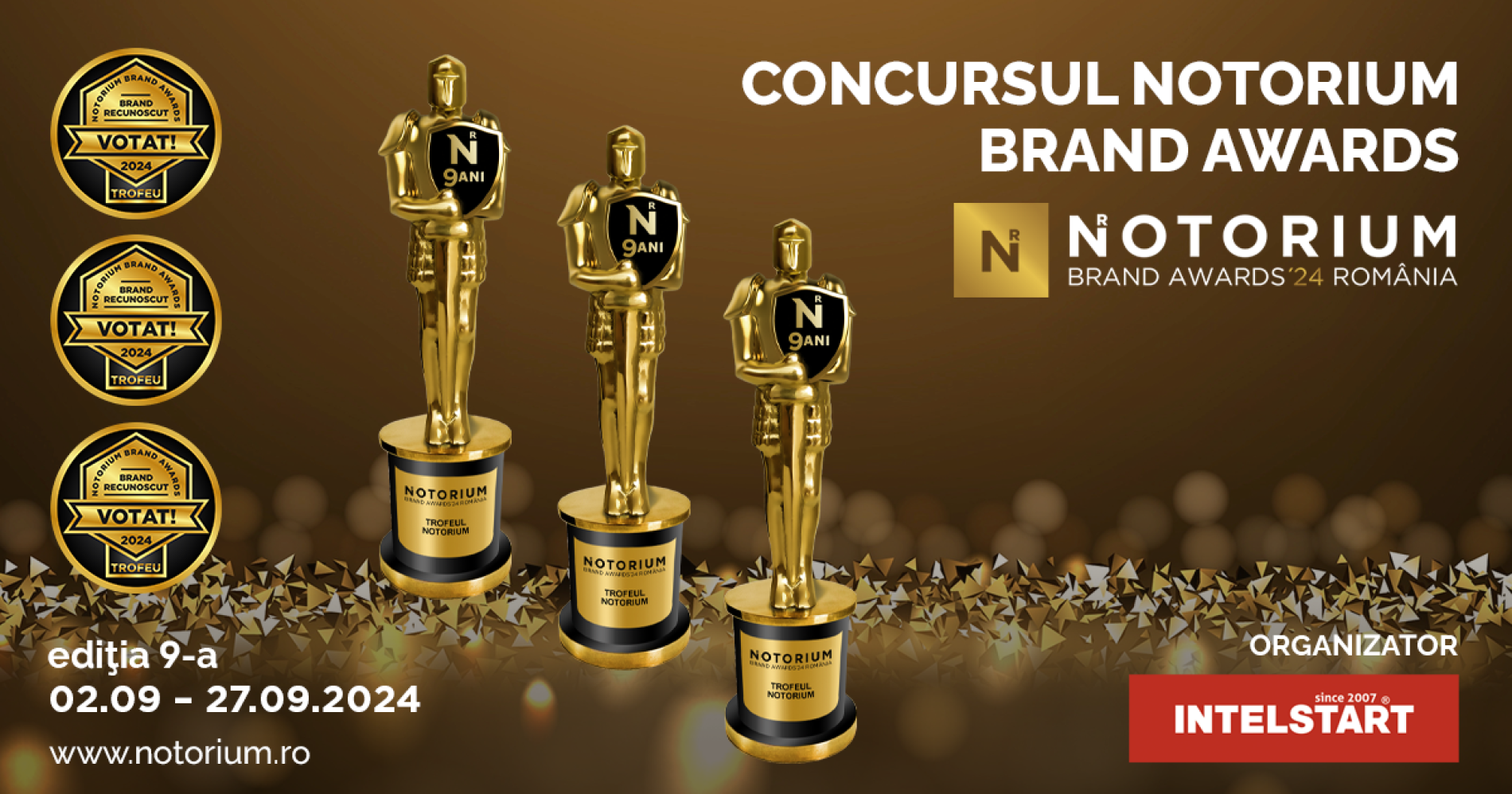 În 2024, CONCURSUL NOTORIUM BRAND AWARDS – www.notorium.ro, organizat de compania de proprietate intelectuală INTELSTART cunoscut pentru recunoașterea celor mai puternice branduri din Republica Moldova, se extinde în România. După opt ediții de succes, această competiție de renume internațional aduce în atenția publicului românesc oportunitatea de a recunoaște și celebra excelența și inovația brandurilor locale și internaționale prezente pe piața din România.